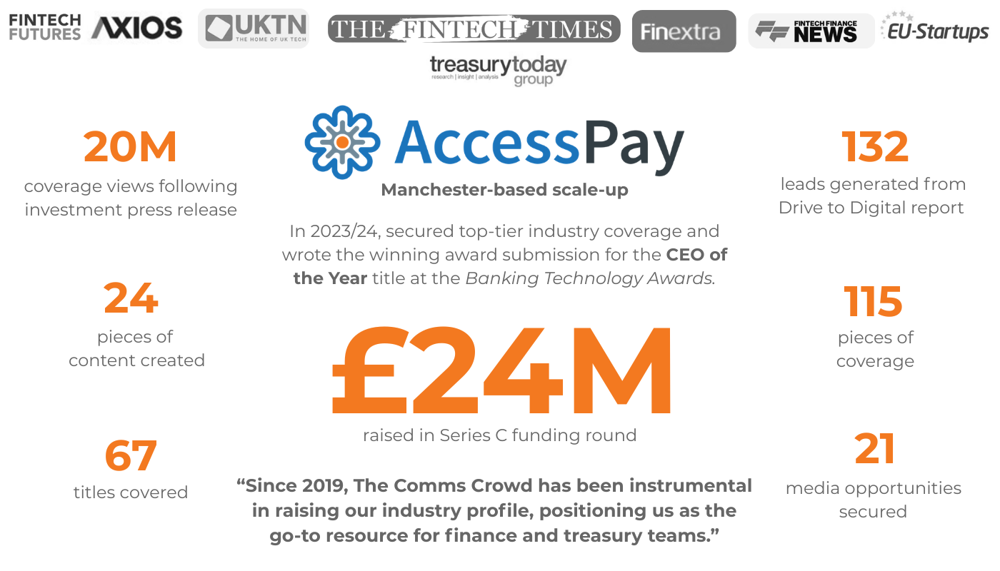 As AccessPay has grown, Comms Crowd’s early low-level support has become a full-service retainer. Comms Crowd has two key roles: the first is as a halo content creator to support wider marketing initiatives, and the second is as AccessPay’s PR team.